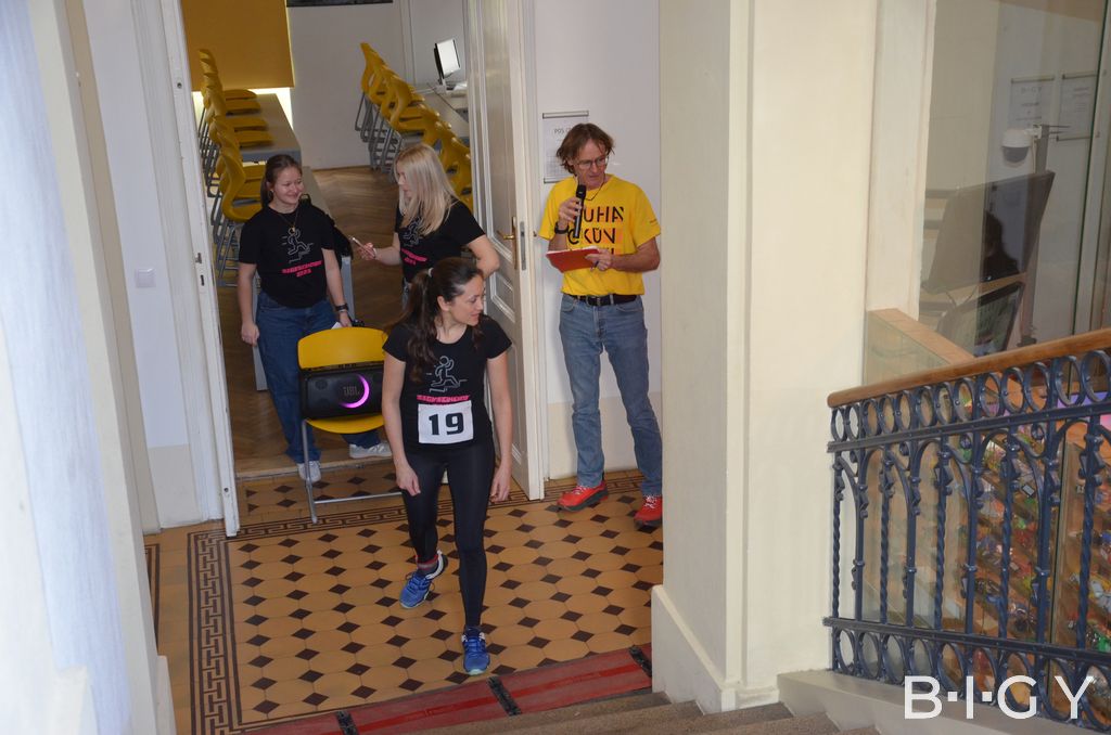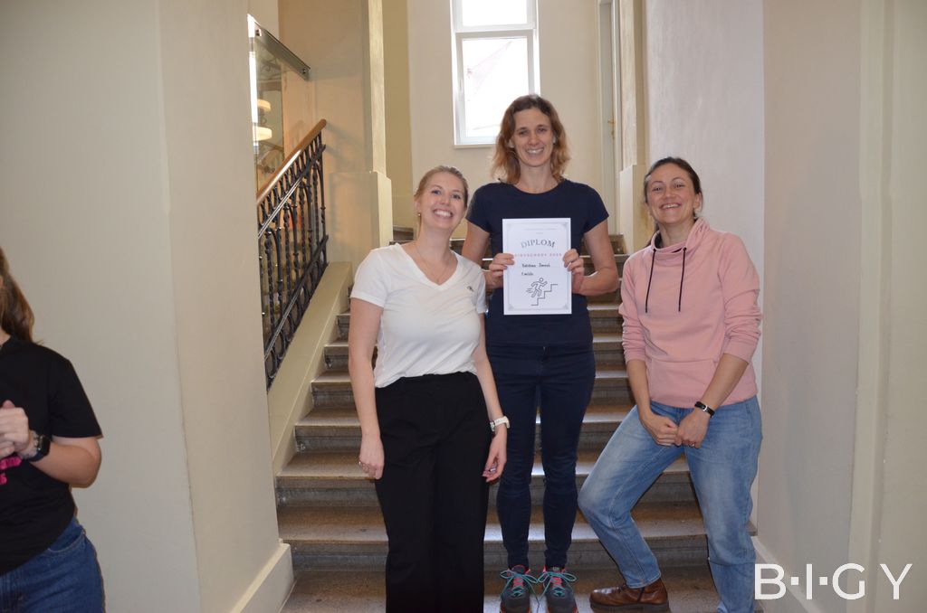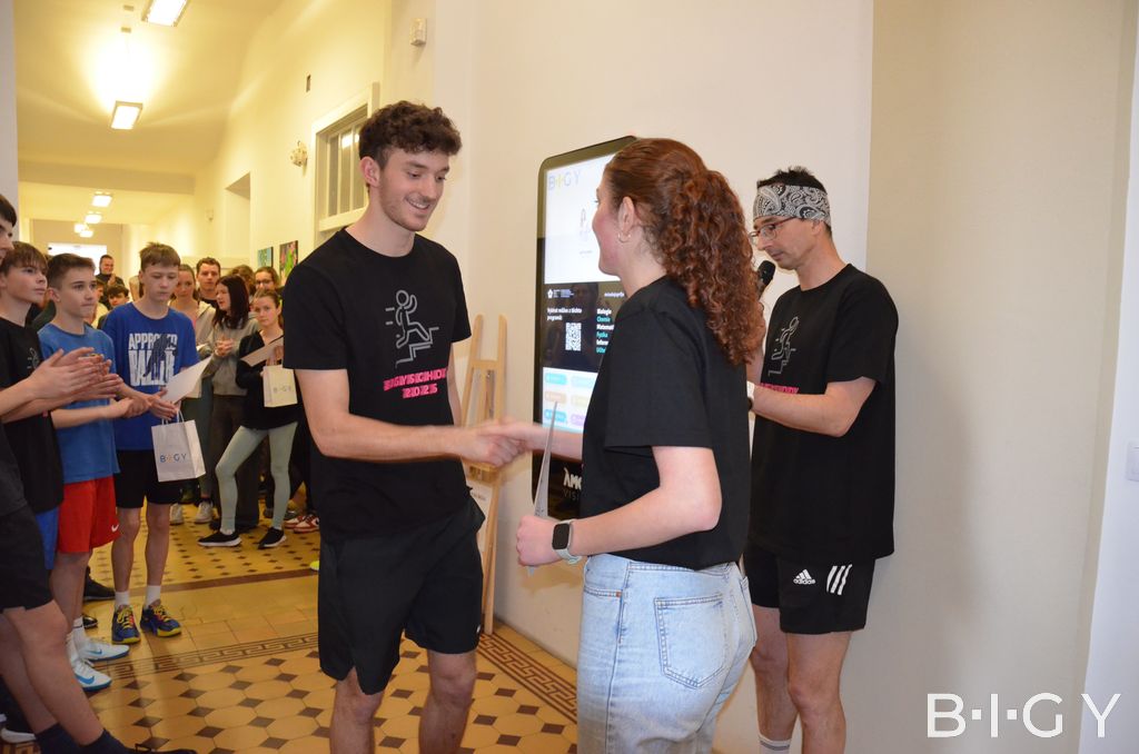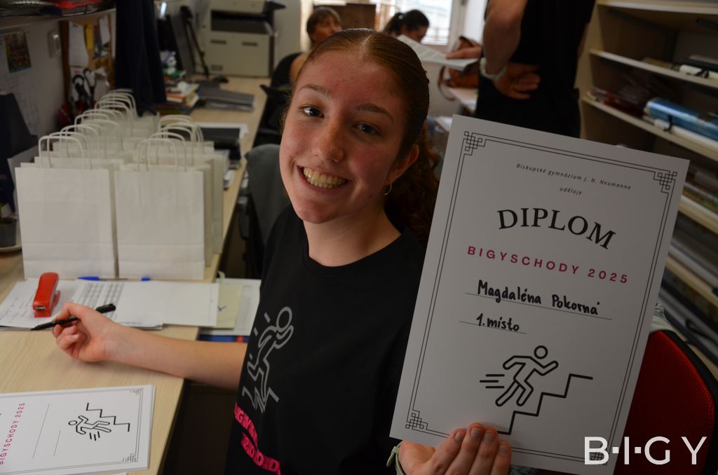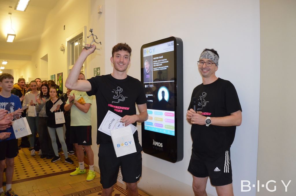 Na poslední den 1. pololetí naše škola připravila pro všechny studenty závod s názvem BIGYSCHODY 2025, který jak název vypovídá spočíval ve výběhu schodů od vrátnice až do posledního patra. Tohoto zdánlivě snadného úkolu se zúčastnilo celkem 46 studentů a učitelů. Řady sportovců velmi aktivně podpořil bývalý spirituál Bigy Vojtěch Blažek. K navození závodního prostředí přispěly také hlasy moderátorek a kvalitní hudba. Tento dvoukolový závod byl hodně napínavý, ale jak se říká vyhrát může jen jeden. Celkovým vítězem se stal Tomáš Kafka ze 4. N, který tak stanovil rekord trati. Kompletní výsledky najdete již nyní na IG a dveřích kabinetu ZE. Dle mého názoru proběhla celá akce v přátelské a příjemné atmosféře za podpory mnoha diváků z řad spolužáků i učitelů. Děkuji všem závodníkům za předvedené výkony a organizátorům a vedení za přípravu a podporu závodu. Firmě 4Timing patří velký dík za technicky bezchybné zajištění závodu.