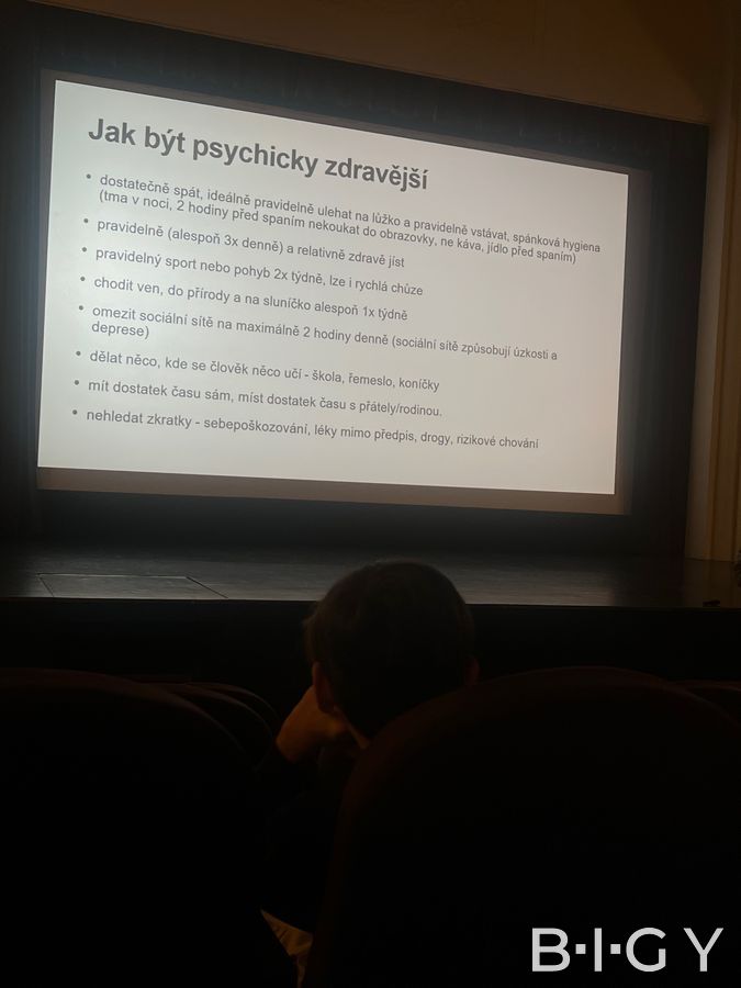 V rámci druhé části programu, která se konala v místním divadle, jsme viděli krátký film o historii psychiatrie a následovala přednáška místního doktora o úzkosti.