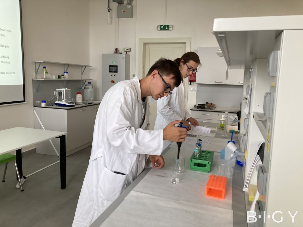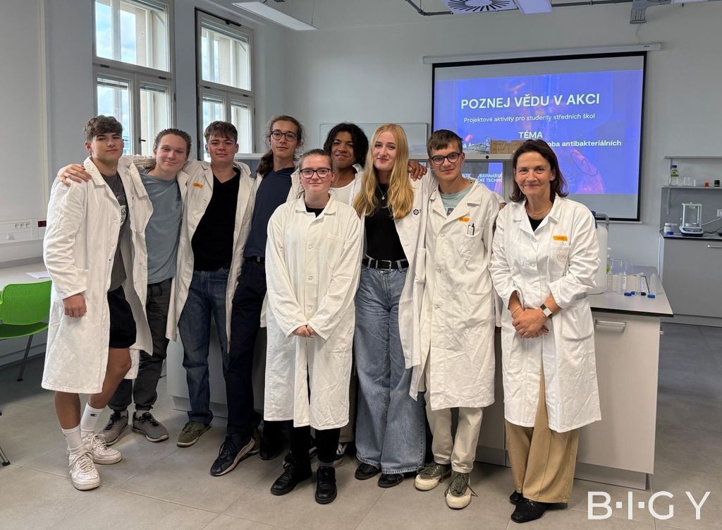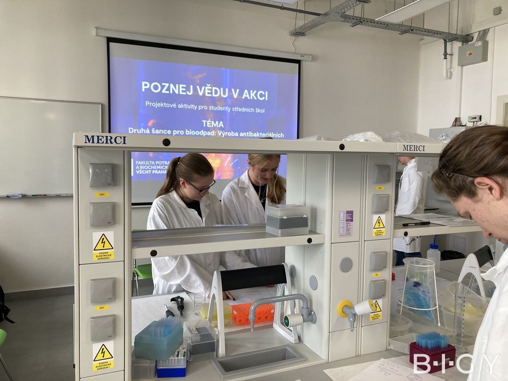 16. září se skupinka studentů pod vedením paní učitelky Herdové sešla na vlakovém nádraží v Českých Budějovicích. Měli namířeno do Prahy, kde pro ně na Vysoké škole chemicko- technické byl připraven program Poznej vědu v akci. Po cestě vlakem následoval rozchod na jídlo a pak už přesun na místo určení. Tady studenti vyráběli antibakteriální stříbrné nanočástice z konopí. Po množství výpočtů, vážení a pipetování následovala diskuse o smyslu a potenciálu námi prováděné výroby. Všichni byli rádi, že si mohli vyzkoušet práci v laboratoři, dozvěděli se něco nového a nemuseli se ten den klasicky učit.