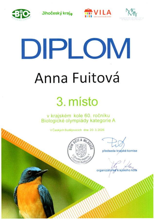 V pátek 20. 3. 2026 se konalo krajské kolo Biologické olympiády kategorie A (jedná se o maturitní a předmaturitní ročníky). Klání se zúčastnilo 35 studentů z gymnázií a z dalších středních škol. Anna Fuitová z 8.A obsadila krásné 3. místo a podařilo se jí dokonce postoupit do ústředního kola Biologické olympiády. Jedná se opravdu o obrovský úspěch!!!