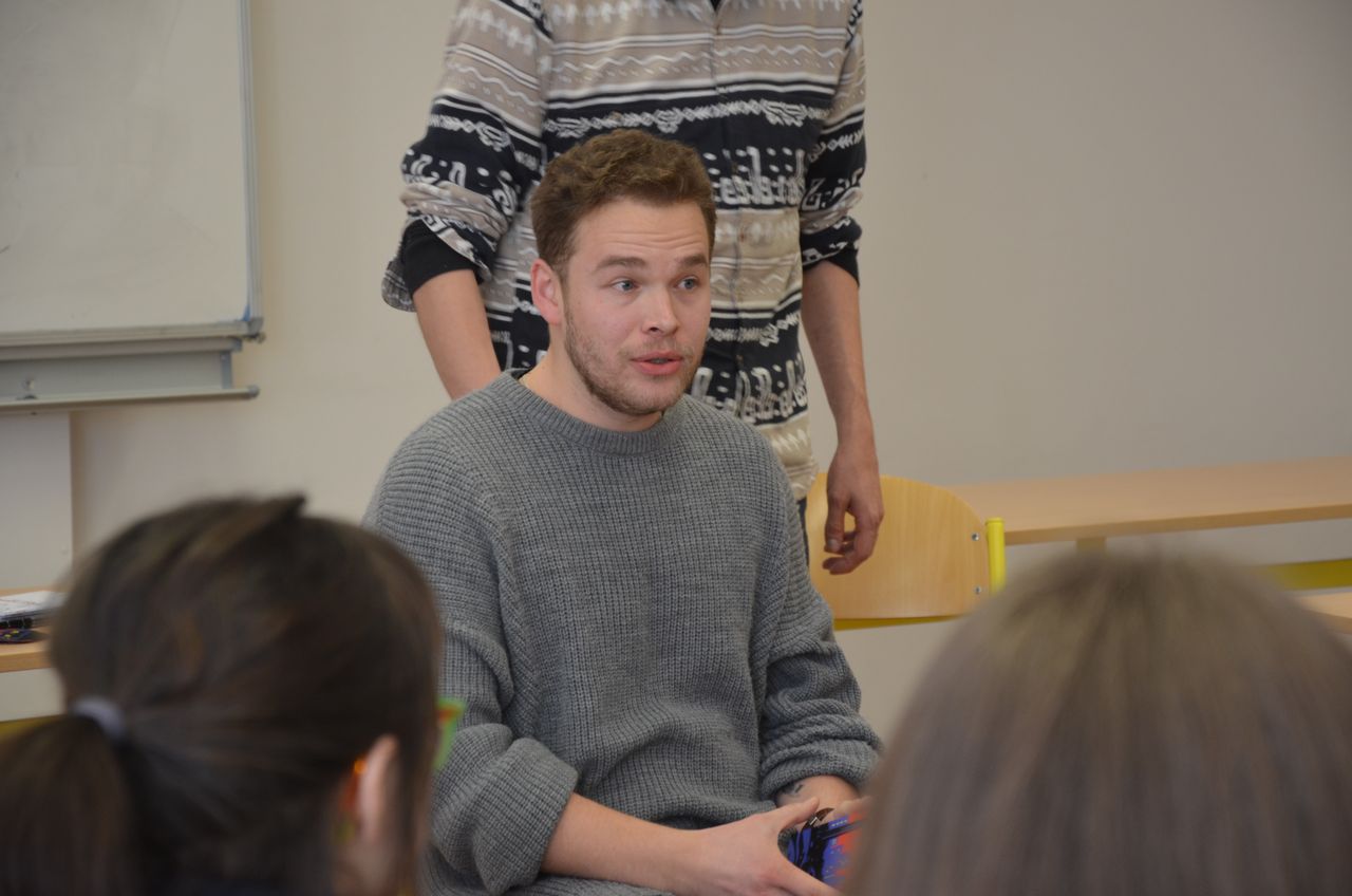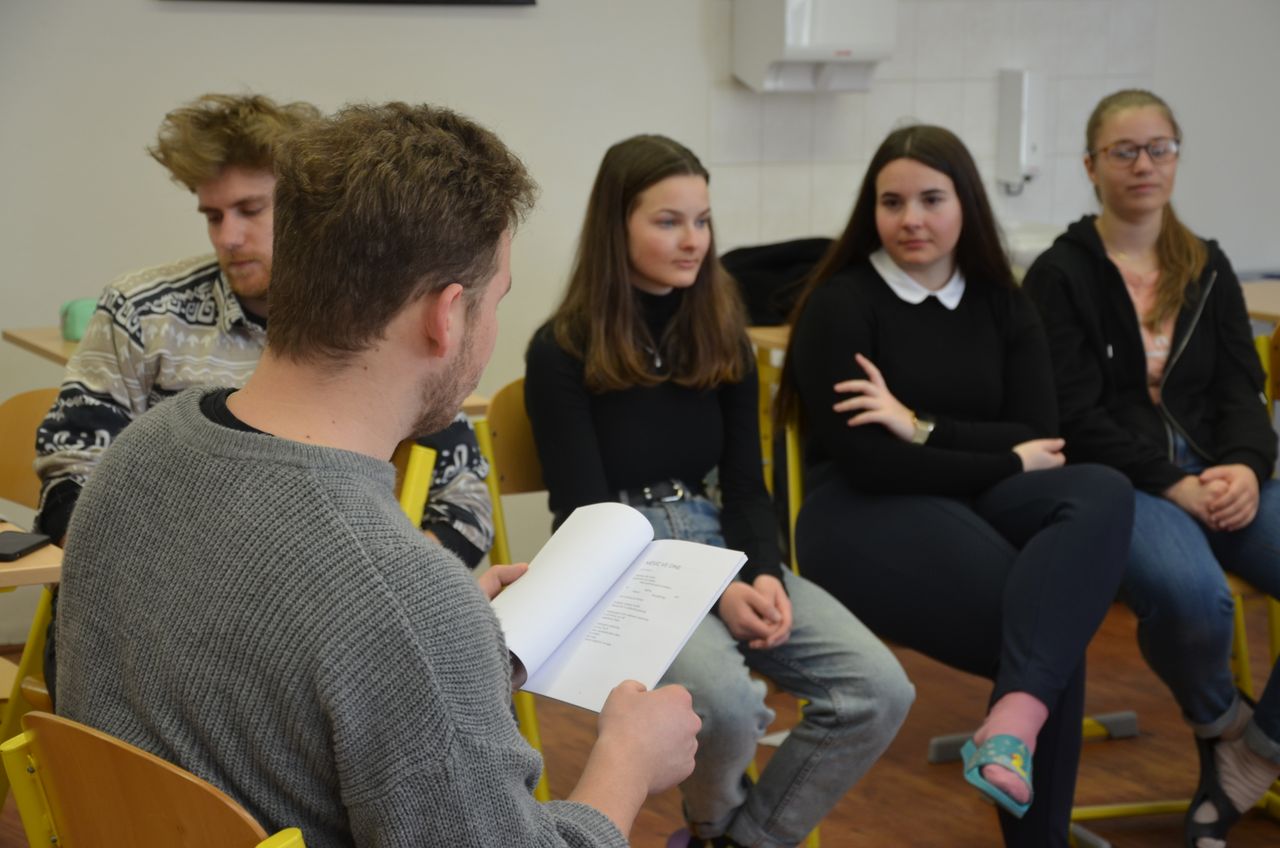 Ve čtvrtek 10. 3. se v rámci žurnalistického semináře na půdě našeho gymnázia uskutečnilo speciální básnické čtení jihočeského básníka Šimona Leitgeba. Básník aktuálně ověnčený prestižní Cenou Jiřího Ortena přečetl ze své nejnovější sbírky Betonová pláž.