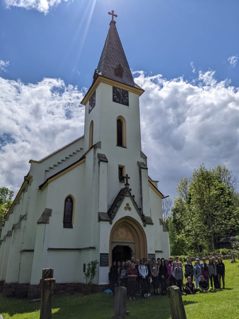 Naše pěší putování začalo na nádraží v Horní Plané. Cesta ubíhala a po hodině svižné chůze nás už vítaly zvony z kostelní věže spolu s panem Wondraschekem, který se zasloužil o rekonstrukci kostela i hřbitova. Následovalo krátké vyprávění o historii místa. Spirituál Vojta Blažek sloužil mši svatou s kytarovým doprovodem a zpěvem. Po ní jsme byli pozváni panem Wondraschkem do místního muzea a na oběd do nedalekého penzionu. Posilněni a občerstveni jsme se vydali na cestu zpět, ta však připomínala poklus, protože jsme se rozhodli pro dřívější vlakové spojení domů.