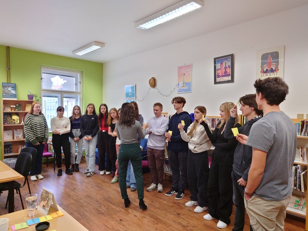 V úterý 23. října vyrazila třída 1. F a následně i francouzštináři z 1. C na návštěvu Francouzské aliance.  V milé společnosti ředitelky Margot Roulland se studenti seznámili s fungováním Aliance a aktivitami, které tato instituce pořádá v Českých Budějovicích. Po prohlídce mediatéky si vyzkoušeli hry, u kterých si uvědomili, že v češtině používáme velké množství slov převzatých z francouzštiny, a tak se ani úplný začátečník v tomto jazyce neztratí. Obzvláště má-li na sobě pravý francouzský béret 😊