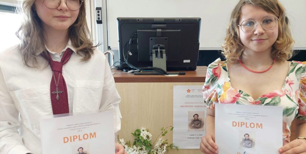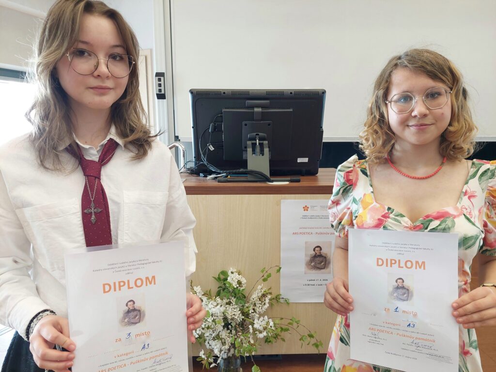 Dne 17. dubna 2026 se naše studentky zúčastnily soutěže Puškinův památník. V sólové recitaci v ruském jazyce se Alexandra Panova umístila na krásném 1. místě a Sára Valíčková na 3. místě. Alexandra postupuje do celostátního kola v Praze, které se uskuteční 5. června 2026. Srdečně gratulujeme!