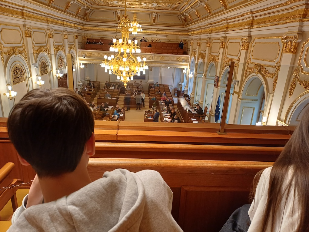 Dne 16. dubna jsme s paní učitelkou Zasadilovou a panem učitelem Hellerem navštívili Poslaneckou sněmovnu Parlamentu České republiky. Pod vedením Tomáše Bernarda jsme měli možnost nahlédnout do poslanecké kanceláře a z galerie sledovat zasedání poslanců v hlavním jednacím sále.