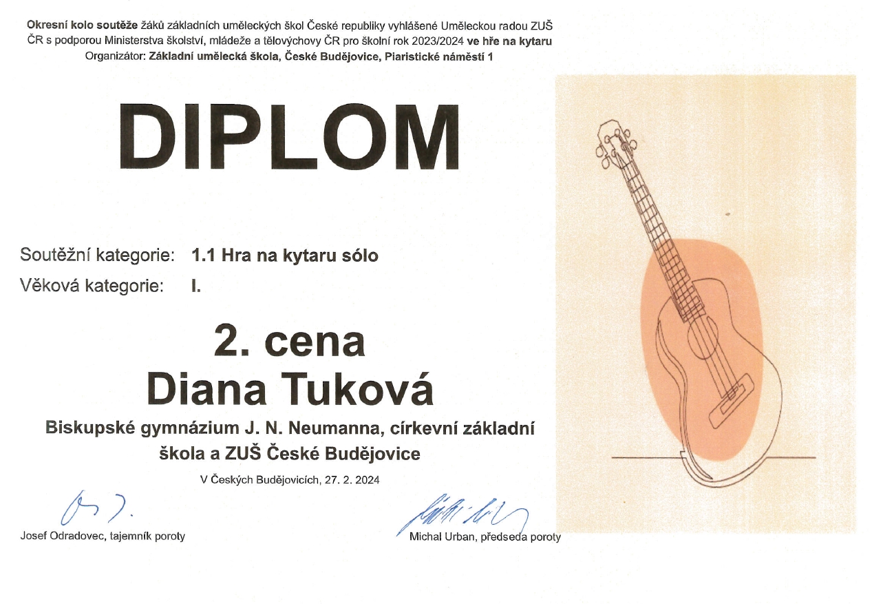 2. cenu ve hře na kytaru získala 27.2.2024 Diana Tuková. Ta soutěžila v ZUŠ na Piaristickém náměstí. I zde byla velká konkurence (soutěžilo 54 sólových kytaristů, samozřejmě podle věku rozdělených kategoriích).