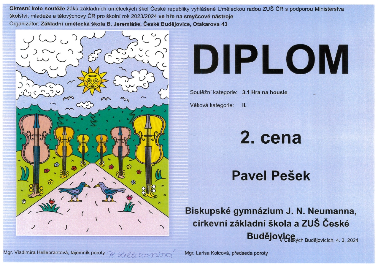 V pondělí 4.3. 2024 v již zmíněné ZUŠ v Otakarově ulici soutěžili houslisté. Tato soutěž byla v okresním kole zastoupena 39 soutěžícími. Pavel Pešek v II. kategorii získal 2. cenu.