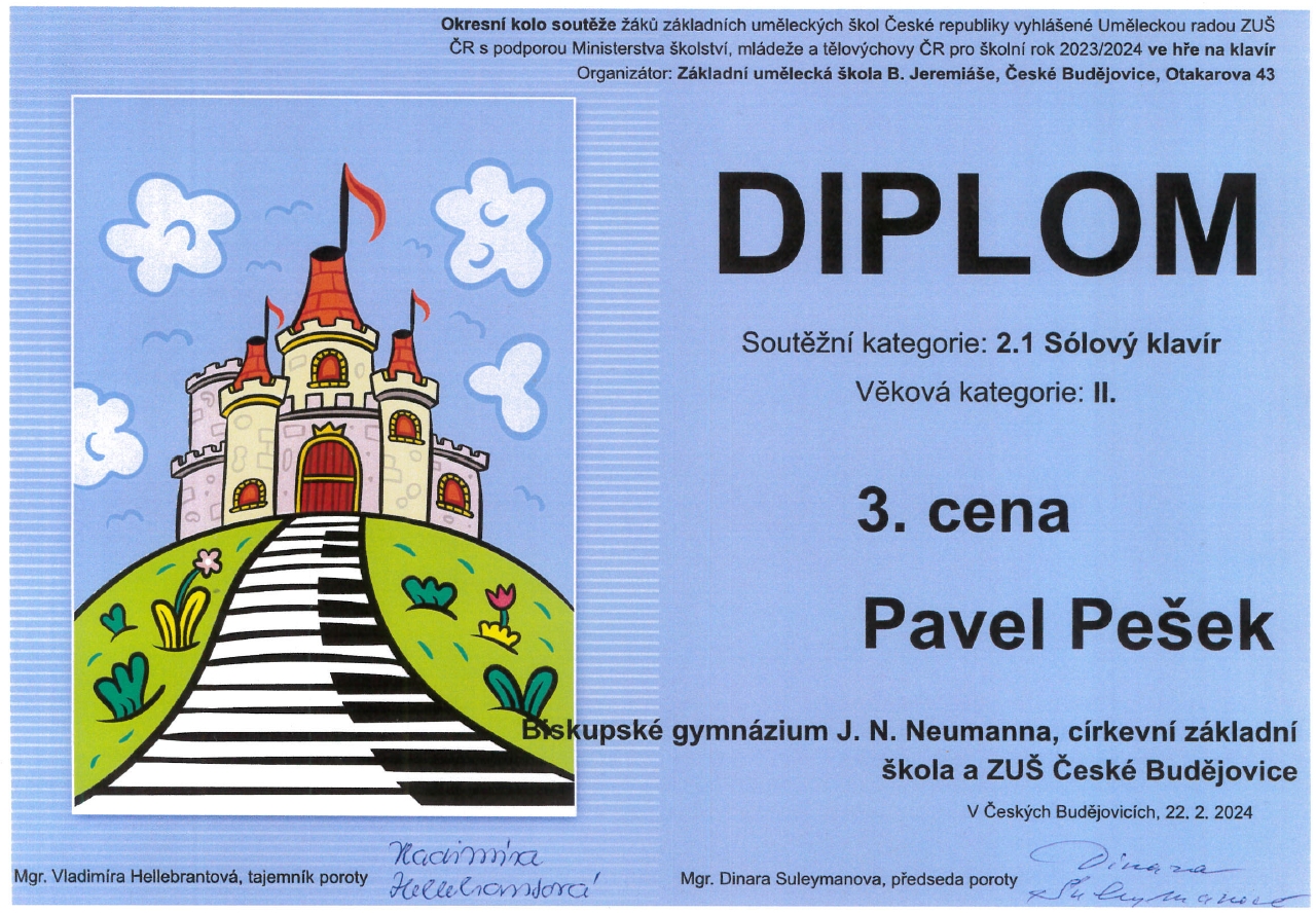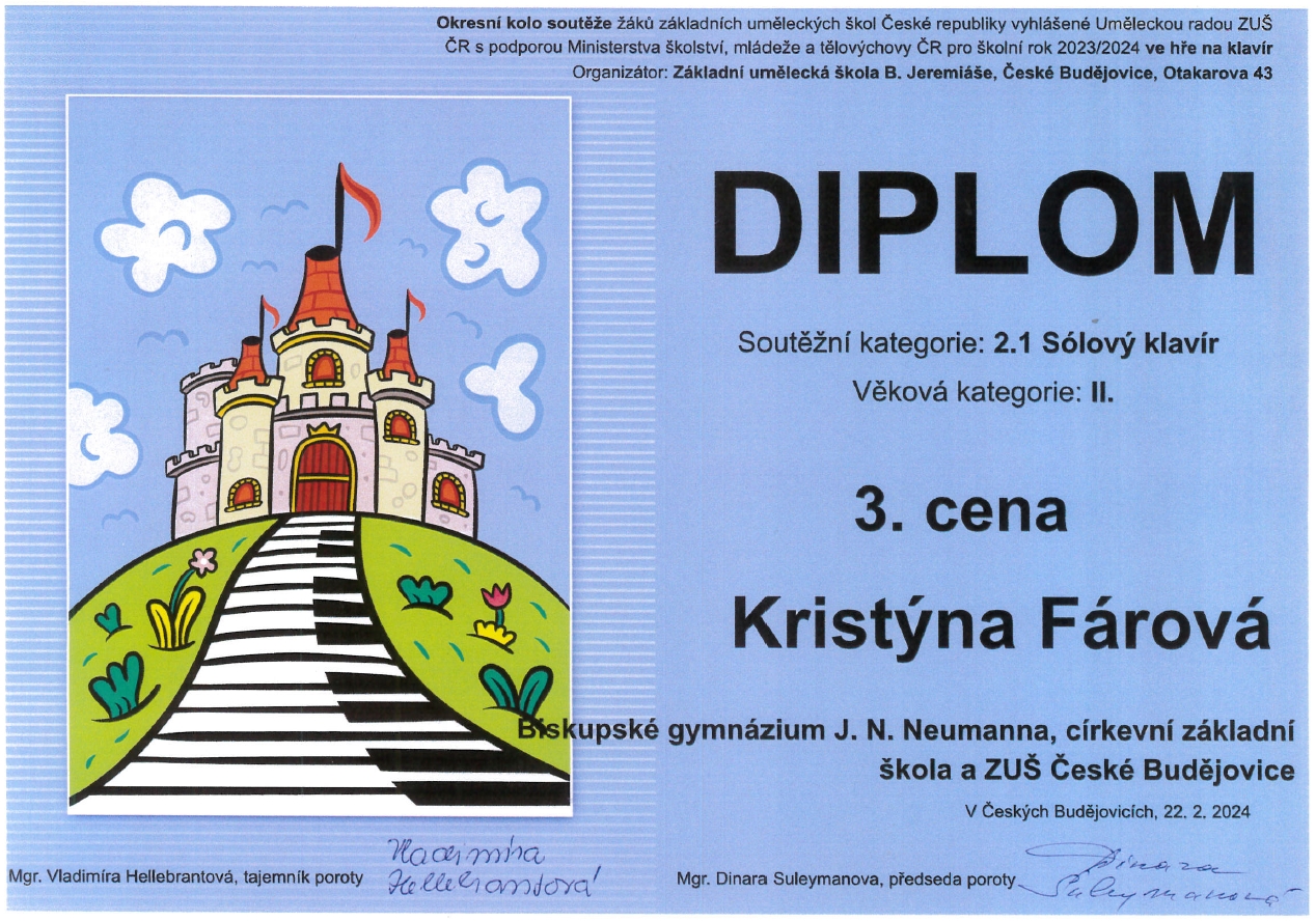 Do okresního kola ve hře na klavír, které se uskutečnilo 22.2. – 23.2. 2024 v ZUŠ B. Jeremiáše v Otakarově ulici, se zapojilo 79 soutěžících z celého ČB okresu v různých věkových kategoriích. Naši 4 klavíristé (Lucie Bigasová, Kristýna Fárová, Pavel Pešek a Viktorie Čermáková) v takto velké konkurenci uspěli. Získali všichni 3. ceny.